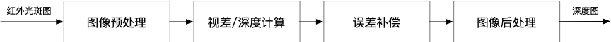 以目前最常见的散斑结构光为例,结构光算法整体流程如下图所示: