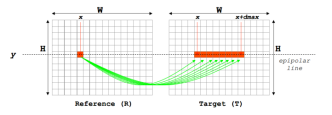 如上图所示,我们会在搜索范围(水平极线)上计算像素的匹配代价(SAD)。