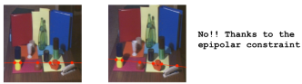 的极线上,这就将搜索范围从一个二维的区间压缩到了一个一维的线段,大大降低了计算量,如下图所示。显然,成像面上的所有极线都相交于极点,比如图7中右图上的所有极线都相交于