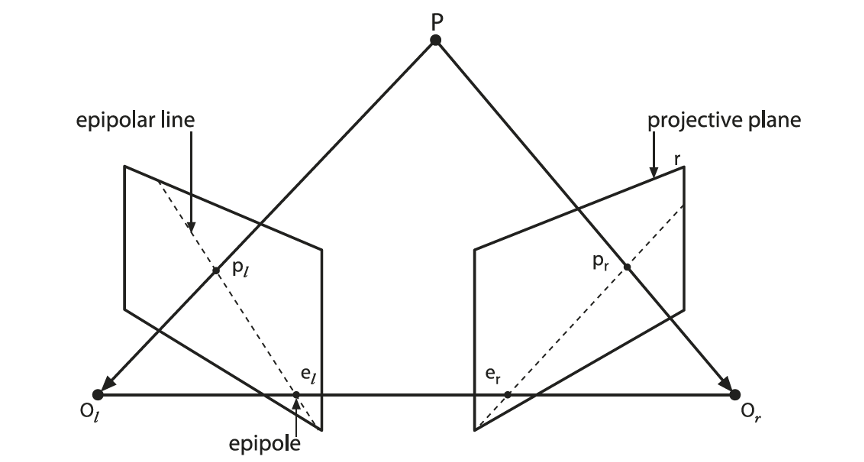 回顾以上,我们得到结论:理想的正面平行双目系统,需要通过相机标定得到相机内外参才能计算深度。但是现实世界中的双目摄像头无法达到理想环境,所以需要采用某种算法,对实际的双目成像系统进行补偿、矫正,譬如将采集到的左右图变形(warp),使之行对齐。为了实现这一点,需要引入极几何(epipolar geometry)的概念。
