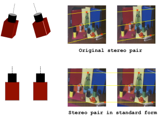 什么是极线矫正呢?简单的讲,就是我们通过标定得到的内外参,计算出两个单应性矩阵(homography),分别对左右视图进行变形(warp),使得左右视图的极点都被挪到了无穷远处,并且极线行对齐(row-alignment),这样就可以直接使用理想正面平行双目系统计算深度信息。