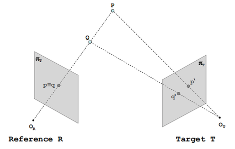 如上图所示, 是两个相机的光心,P是三维空间中的任意一点,和两个相机的光心