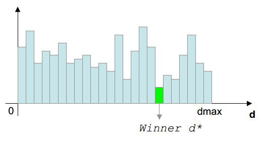 如图12所示,我们会在视差搜索范围内比较得到的每个代价值,然后选取最小的代价值对应的视差作为该像素的视差结果。