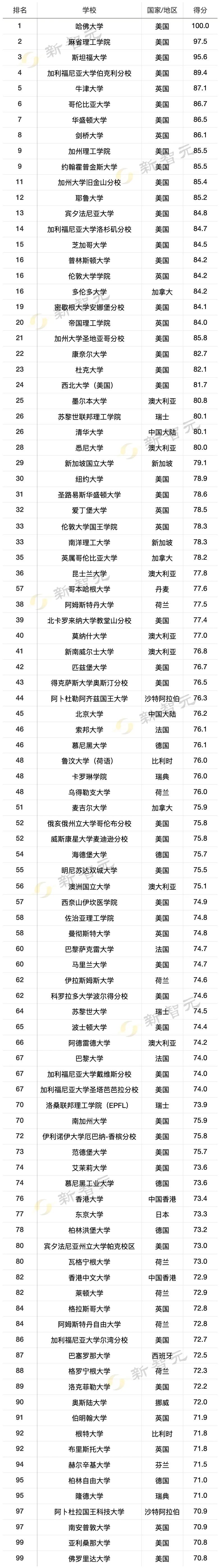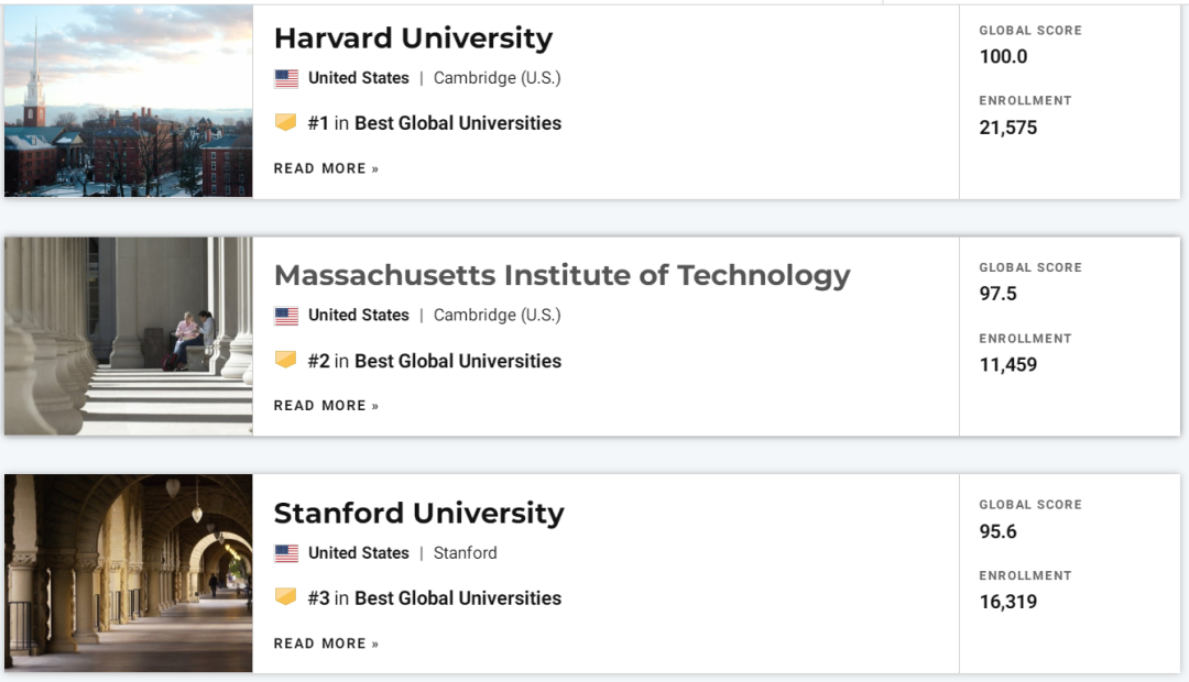 榜单前三和去年一模一样,哈佛、麻省理工、斯坦福稳坐钓鱼台。