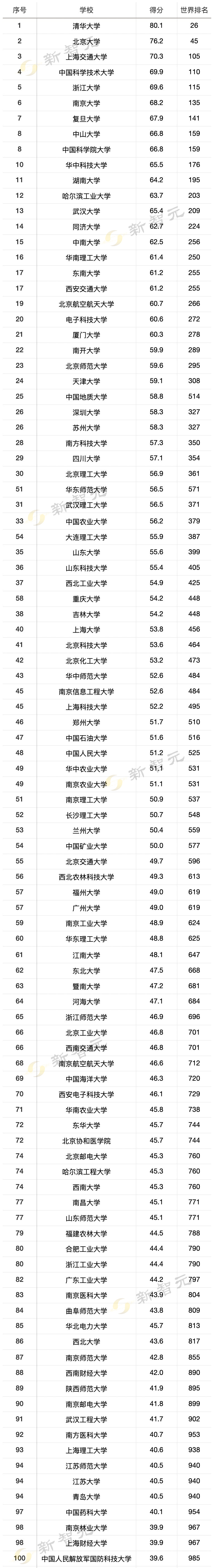 除了清华和北大,上海交通大学(12名)、浙江大学(15名)、电子科技大学(19名)、武汉大学(21名)、哈尔滨工业大学(22名)、华中科技大学(24名)、西安电子科技大学(34名)、中国科技大学(39名)、南京大学(43名)、北京航空航天大学(44名)、东南大学(49名)、西北工业大学(50名)、中山大学(50名)纷纷跻身前50。