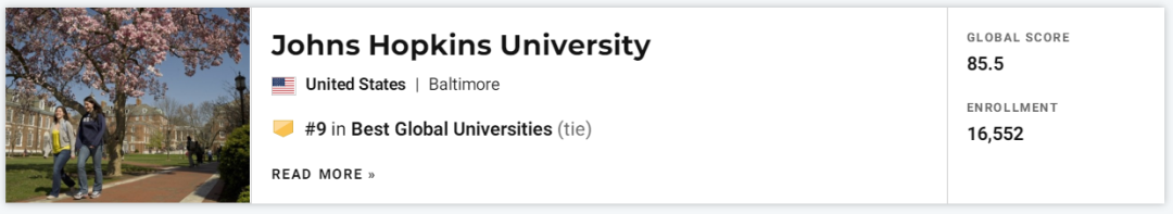 是的,约翰霍普金斯大学去年就靠着疫情播报被网友戏称「比川普靠谱」,成功出圈,一举冲进了U. S. News全球大学榜单前10,今年的它又再次保持住了名次。