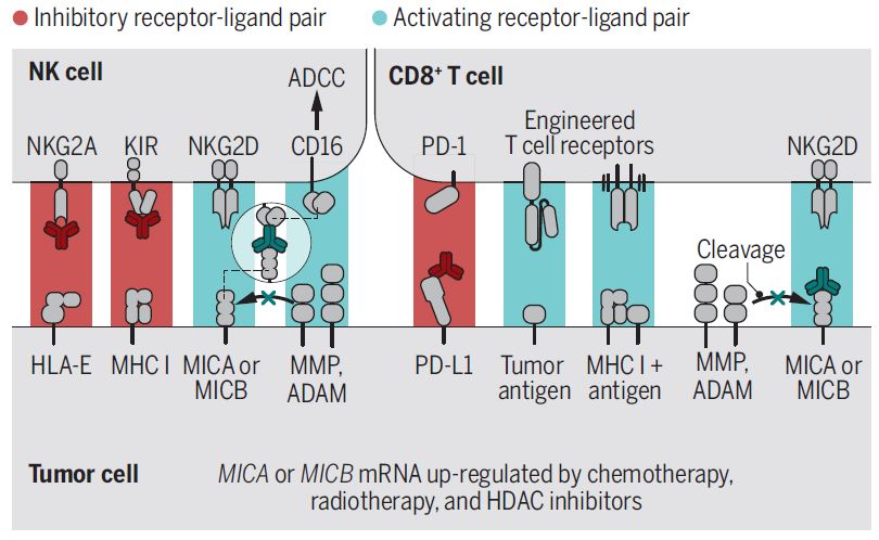 与CD8+ T细胞不同,NK细胞是天然淋巴细胞,能够表达“识别肿瘤细胞和病原体感染细胞表面配体”的受体,如NKG2D(NK group 2D)受体。NKG2D-NKG2D配体轴(NKG2D–NKG2D ligand axis)是人类NK细胞介导的肿瘤细胞和病毒感染细胞识别的主要激活通路。