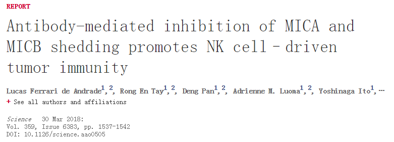 那么,是否有一种方法,能够阻止MICA 和 MICB这类蛋白从肿瘤表面脱落,从而让免疫系统能发挥抗癌作用呢?这正是Kai W. Wucherpfennig教授带领的团队在题为“Antibody-mediated inhibition of MICA and MICB shedding promotes NK cell–driven tumor immunity”的Science论文中回答的问题。
