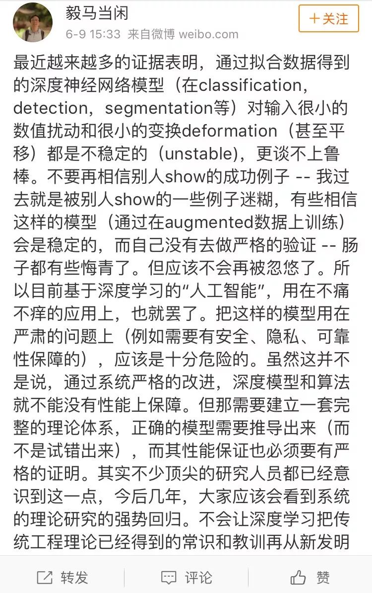 UC伯克利大学教授马毅最近也发微博称,越来越多的证据表明,通过拟合数据得到的深度神经网络模型(在classification,detection,segmentation等)对输入很小的数值扰动和很小的变换deformation(甚至平移)都是不稳定的(unstable),更谈不上鲁棒。