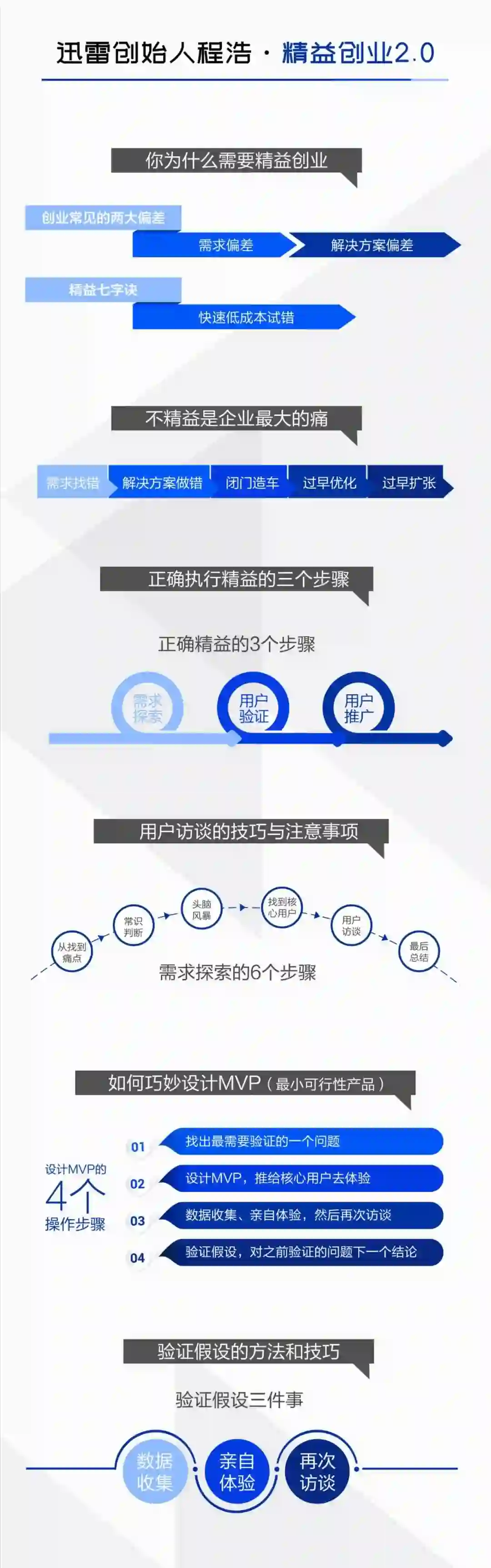 结合迅雷并不平坦的创业经历,以及十多年企业一线管理的实战经验,程浩对埃里克·莱斯的《精益创业》做了深入的研究,也在自身实战基础上做了全新和丰富的解读,甚至在转型投资人后,多次作为创业营的导师,给国内的创业者们讲过精益创业的课程。