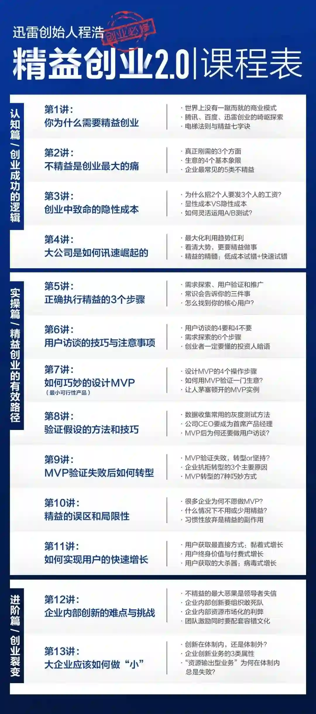 课程共分为13讲,每一讲的主题环环相扣,围绕“需求探索+用户验证+推广裂变”的精益创业三板斧,详细拆解创业各阶段的操作流程与动作,帮你掌握从创意到创业、从0成长为10亿美金公司所需的一整套可行方案: