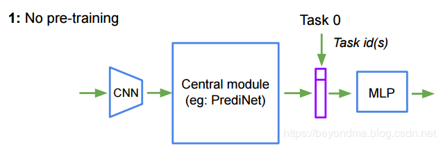 这次DeepMind提出的PrediNet方案,与之前的架构不尽相同,输入先经过CNN(卷积神经网络)处理,再由PrediNet处理,最后由MLP(多层感知机)进行输出如下图所示,读者可以把PrediNet看做是一个管道,连接在CNN和MLP之间。而实验的结果也说明,PrediNet训练完成后是可以被复用到的。