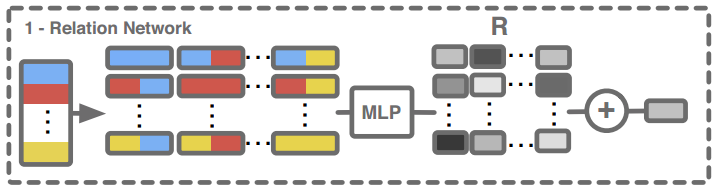 在PrediNet引用的论文“Reconciling deep learning with symbolic artificial intelligence: representing objects and relations”提出了这样一种架构,先由Relation Network处理,其中Relation(关系)是由one-hot向量表示的,也就是每个relation都是彼此独立的,彼此不相关,比如性别中的男、女就是彼此独立的,用one-hot向量表示就是(0,1)和(1,0),而如果这时把他们放入同一维度表示为1和2,就会出现一些问题,因为1和2在数学就有倍数关系存在相关性了。如果读者不好理解,可以把relation简单理解为符号(symbol),输入序列经过关系网络(Relation Network)的处理,输出给MLP(多层感知机),得到最终输出。