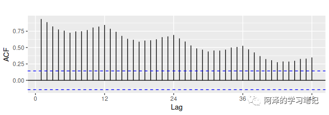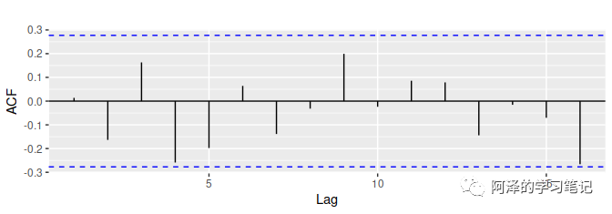 对于白噪声而言,我们期望它的自相关值接近 0。但是由于随机扰动的存在,自相关值并不会精确地等于 0。对于一个长度为 T 的白噪声序列而言,我们期望在 0.95 的置信度下,它的自相关值处于 之间。我们可以很容易的画出 ACF 的边界值(图中蓝色虚线)。如果一个序列中有较多的自相关值处于边界之外,那么该序列很可能不是白噪声序列。