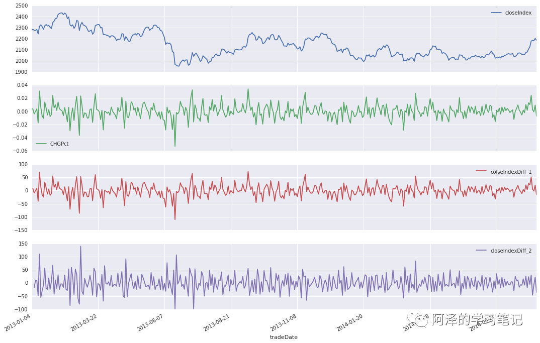 一般来说,做个一阶差分就可以得到接近平稳的时间序列了,如果方差随时间变化较大,那么可以先取 log 再做一阶差分。如下图所示:上面两张图为非平稳的时间序列,经过一阶差分后便得到了相对平稳的时间序列。当然,经过二阶差分后,其效果会更好。