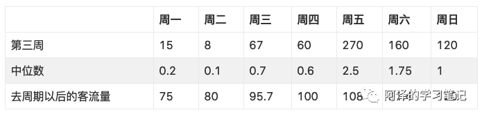 直接用最后一周的平均客流量作为base并不一定是最好的方法。也许最后三天或最后五天的均值能更好的反映最新的情况。但是,我们不能直接对最后三天客流量取均值(最后三天是周末,这样取的base就偏大了)。需要去掉周期性因素后,再取平均。具体做法,就是用客流量除以周期因子。