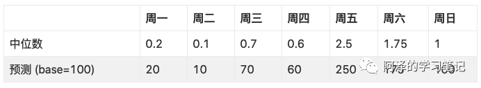 做预测时只需要将周期因子乘以一个 base,便可作为下一周的预测。比如我们取最后一周的平均客流量 100 作为 base,那么我们直接乘上周期因子,就得到下一周的预测: