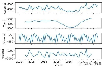 下图展示了一个时间序列被分解的过程,第一张图是所观察的时间序列,第二张图是趋势、第三张图是季节性,第四张图是残差: