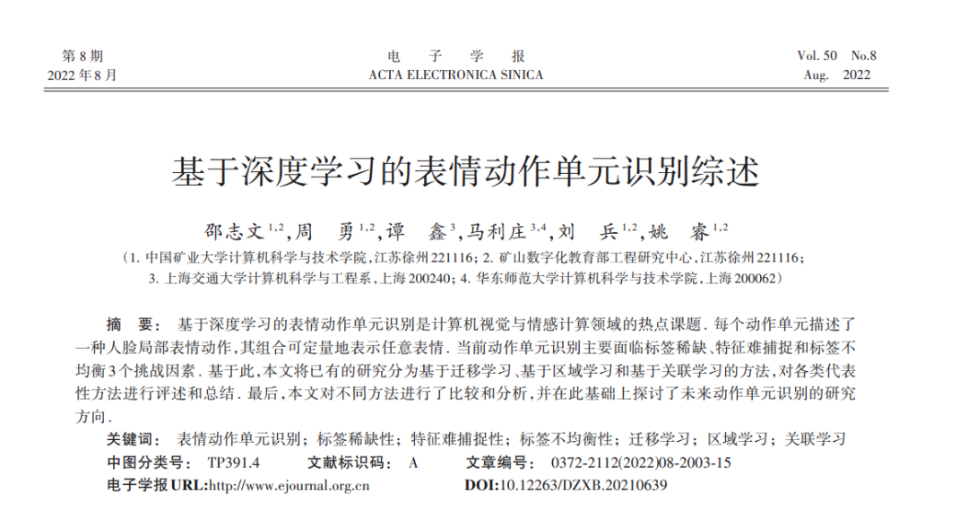 鉴于此,本文主要讨论基于深度学习的表情AU识别工作,对这一领域的代表性方法进行分类、评述和总结,弥补现有人脸表情识别综述的不足.本文接下来首先介绍AU识别的问题定义、挑战和评测数据集,然后从迁移学习、区域学习和关联学习3个角度对已有工作进行概述,之后将一些主流AU识别方法的性能进行了比较,最后探讨了AU识别未来的研究趋势.