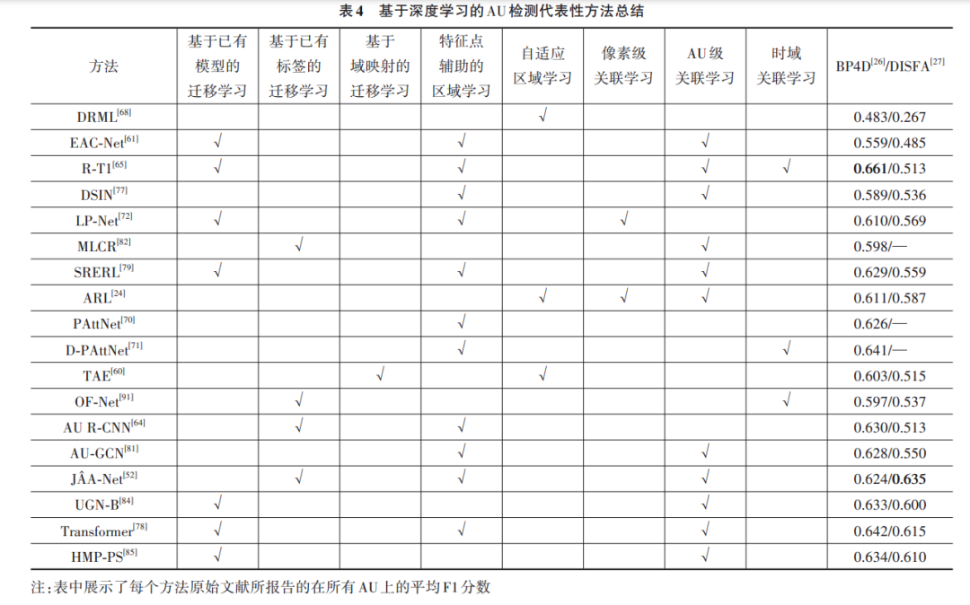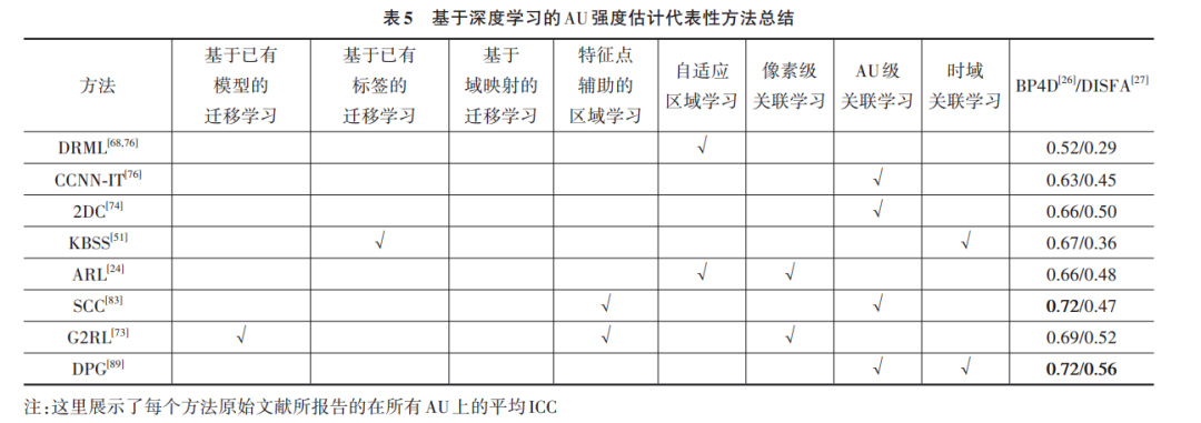 表 4、表 5 分别对代表性的基于深度学习的 AU 检 测和AU强度估计方法进行了总结和对比,从中可以观 察到如下几方面的现象.
