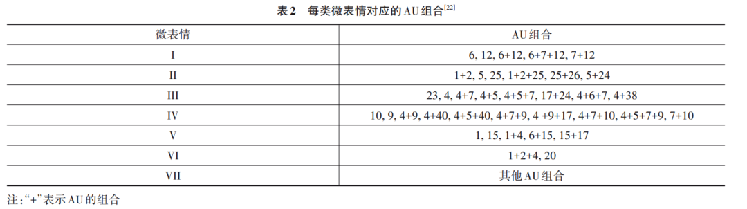 表1列出了每类整体表情中可能出现的AU[16],这些AU同时出现或部分同时出现于整体表情,例如快乐表情可以由AU 6,AU 12和AU 25的组合来表示,悲伤表情可以由AU 1,AU 4,AU 6和AU 17的组合来表示.值得注意的是,人们在意识到自身表露出一种可能不合适的表情时经常会试图抑制它来隐藏真实的情绪,而只要试图掩盖原来的表情其面部便会自发地出现微表情(Micro-Expression)[19].微表情的持续时间很短,一般的界定标准为持续时间不超过500 ms[20],这是其区别于宏表情(Macro-Expression)的主要特征[21].微表情也可以用AU的组合进行描述,表2具体定义了每类微表情对应的AU组合[22],其中I,II,III,IV,V和VI类分别与快乐、惊讶、愤怒、厌恶、悲伤和恐惧相关,VII类与蔑视等其他微表情相关.例如,微表情I类可以由AU 6,AU 7和AU 12的组合或单个AU 6来表示.因此,研究AU识别对微表情识别同样具有重要意义.