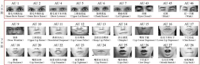 人脸表情出现时,一些局部区域会发生肌肉动作.人脸动作编码系统(FACS)[6,7]基于人脸解剖学所划分的局部肌肉,定义了一个基本面部动作即动作单元(AU)的集合.每个AU涉及一个或多个局部肌肉,具有0,1,2,3,4,5这6个强度级别,其中0表示不出现而5则表示出现的强度最大,因而可以客观且定量地描述人脸精细表情.图2展示了常见的27个AU的示例图片及定义,其中9个AU出现在上半脸,18个AU出现在下半脸.可以发现,每个AU都是一种局部的面部动作,刻画了细微表情.形式化地,任一人脸表情可以由这些AU出现的强度所构成的向量