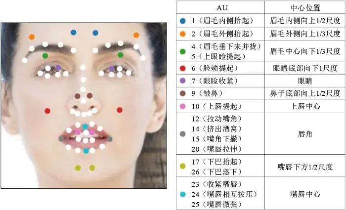 图5 常见AU的中心位置及可视化注:其中每2个相同颜色的点表示某一AU的2个对称的中心.“尺度”指2个内眼角之间的距离. 白色的点表示49个人脸特征点,其中一些点被AU的中心覆盖