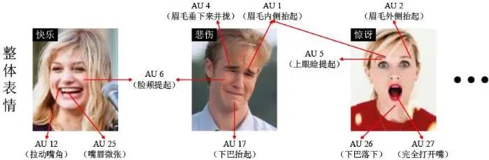 人脸动作编码系统(Facial Action Coding System,FACS)[6,7]定义了几十个表情动作单元(Action Unit,AU),是目前描述人脸局部细微表情最全面和客观的系统之一.如图1所示,快乐、悲伤、惊讶等整体表情被定量地解析为多个AU的组合,每个AU是一个基本面部动作,与一或多个人脸局部肌肉动作有关.在一个人脸表情中,可能只出现一个AU,也可能同时出现多个AU.虽然FACS只定义了几十个AU,但是每个AU具有从低到高的多个强度级别,因而AU的组合可表示7 000种以上真实存在的表情[8],满足了精细刻画表情的需要.