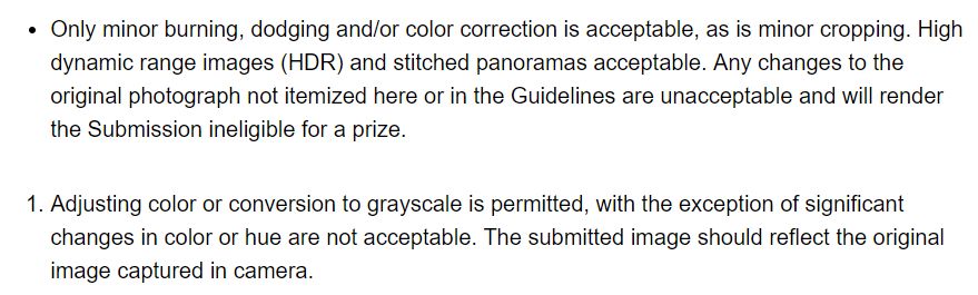 小幅度的加深减淡、色彩改变、后期裁剪是允许的。HDR曝光合并和全景拼接照片是允许的。彩色转成黑白是允许的。