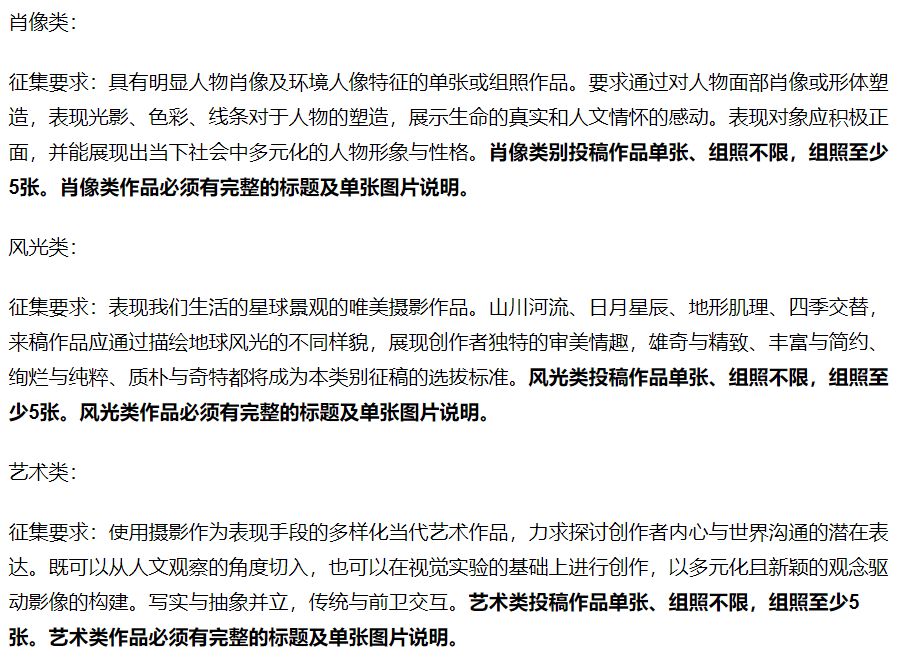 每个摄影比赛,都会有专门的页面,列举详细的参赛须知。