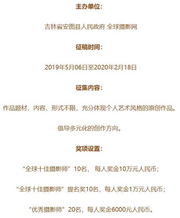 所有不需要参赛费(以及其他后续费用)的比赛,无论含金量高低,至少不会是坑钱的比赛了。这些比赛对摄影爱好者是极为友好的。