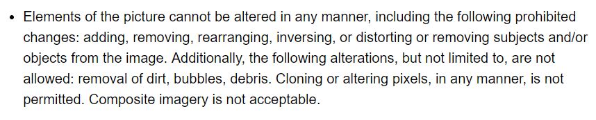 照片中的物体和元素不能有任何改动,包括添加、移除、反相、变形,以及去除画面中的任何物体。去除赃物、泡沫、垃圾、仿制物体、合成场景等等都是被禁止的。