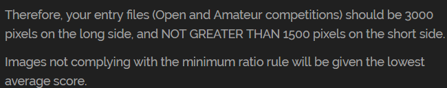 如果这些不对那肯定就白忙活了。 比如Epson Pano Awards,就要求照片的长宽比必须大于2:1,而且长边必须是不多不少的3000像素,要参与年度摄影师评选必须至少提交4张照片等。