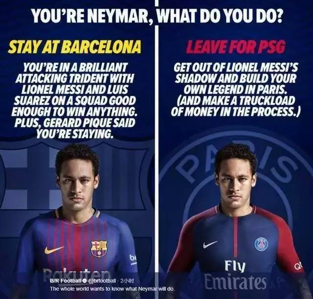 但反过来说, 已经三十岁的梅西依然牢牢占着俱乐部内的头把交椅。7月份刚刚续约的巴萨老大梅西,周薪高达55万欧元,与当时内马尔的工资收入差距近一倍。如果留在巴萨,无论如何表现,内马尔恐怕永远都只能屈居于梅西之下。而梅西的巅峰期至少还有两三年,内马尔如果想要拿到金球奖,与梅西、C罗等人在同一平台上抗衡,恐怕只能另立山头。打个不恰当的篮球界比方,内马尔如今在竞技方面的心态很像是处在詹姆斯阴影下的凯里·欧文(Kyrie Owen),都曾经拿过各自领域的最高团体荣誉,但是在巨树身旁,难以自由生长。