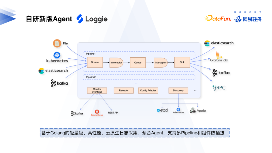 基于Filebeat和现有主流数据采集工具的情况,我们决定自研日志采集Agent——Loggie。它是基于Golang的轻量级、⾼性能、云原⽣⽇志采集、聚合Agent,⽀持多Pipeline和组件热插拔,整体架构如图。