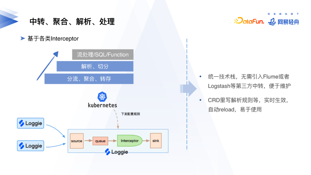 Agent既可以作为日志采集客户端,也可以作为中转机使用。在日志中转方面,我们通过实现Interceptor模块逻辑实现日志的分流、聚合、转存、解析、切分等。通过K8s的CRD可以下发日志采集Agent配置。新的日志采集架构整体维护成本更低。