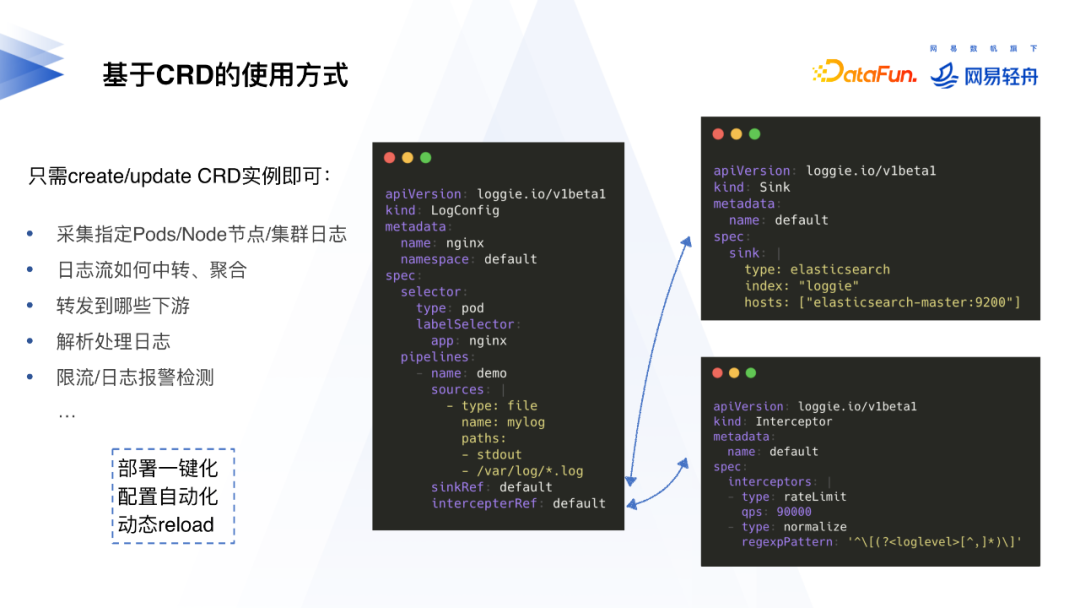 通过CRD的方式打通日志处理链路,用户可以通过配置CRD定义日志中转、聚合和发送的方案,可以配置日志的解析、限流、报警规则,在进行私有化部署和将日志服务平台化时大大降低了配置管理的复杂度,一旦有配置变更,k8s可以快速地把配置同步到日志采集服务中。