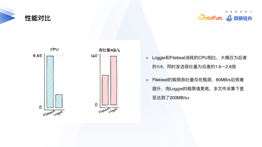 测试结果上看Loggie性能大幅度提升,消耗CPU为Filebeat的1/4、吞吐量为Filebeat的1.6-2.6倍,且极限吞吐量与Filebeat的80MB/s瓶颈提升到200MB/s以上。