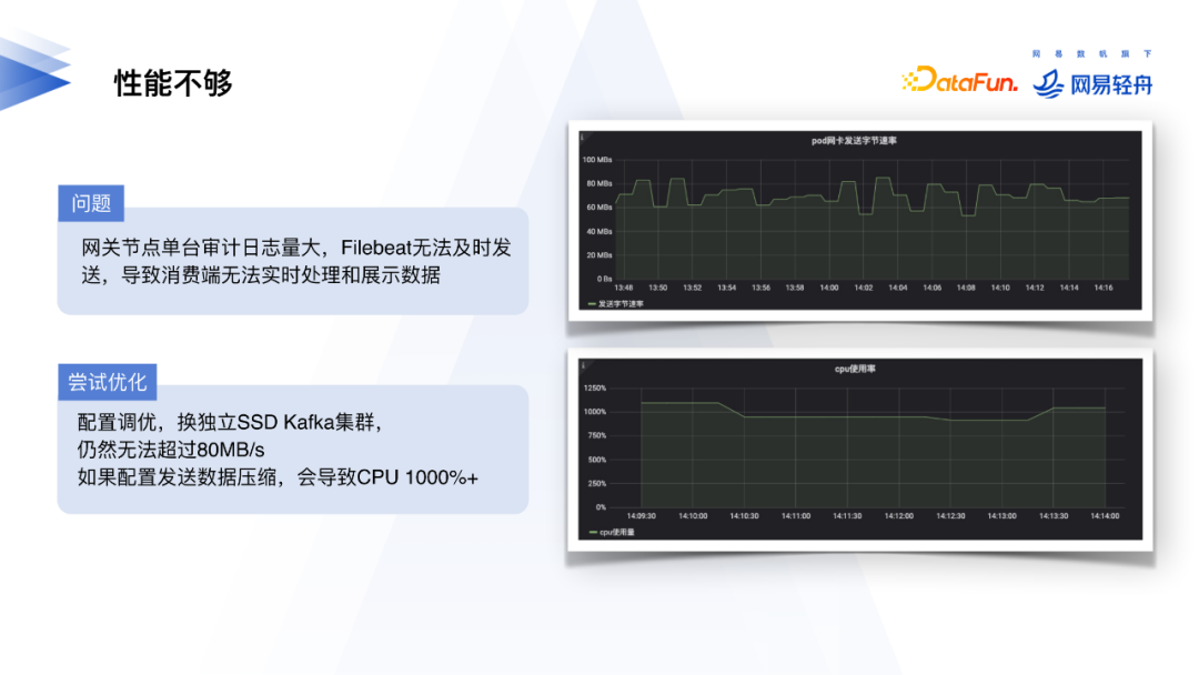 在一个大流量的节点,我们发现Filebeat发送数据到下游Kafka时整体数据处理速度不理想,于是进行了很多优化的尝试,比如换SSD的Kafka集群、改Kafka配置、优化Filebeat配置等调优。我们发现在Filebeat不打开数据压缩的情况下,最大数据发送速度达到80MB/s后很难再有提升,打开数据压缩后Filebeat的CPU的消耗又暴增。调整Kafka或Filebeat参数、机器等配置的优化效果不明显。