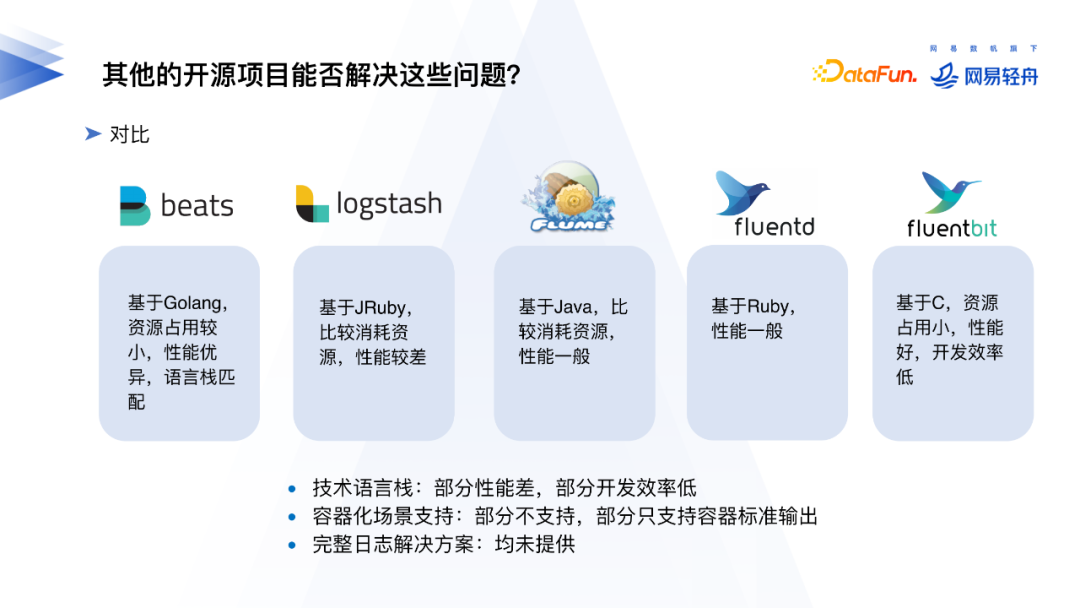 那么除了Filebeat外,其他的日志采集工具能不能满足需求?当前主流的日志采集Agent对容器化场景下的日志采集支持不太理想,大部分开源日志采集工具仅支持到容器标准输出的采集,对云原生下日志采集也没有整体解决方案。