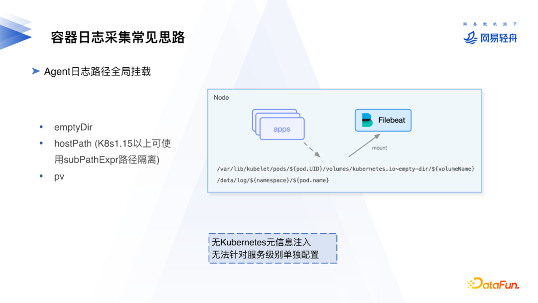 日志打印到标准输出的操作虽然符合云原生十二要素,但是很多业务还是习惯输出到日志文件中,而且只采集标准输出日志难以满足一些复杂业务的需求。常规的采集标准输出日志的方式是挂载/var/lib/docker,/var/log/pods下的目录。同时需要注意选型的日志Agent是否支持注入k8s元信息。