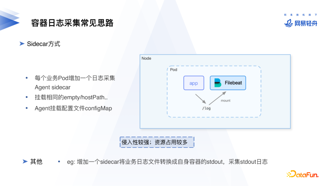 每个业务Pod在部署时都增加一个日志采集的Agent SideCar,可以通过容器平台或k8s webhook的方式把日志采集Agent注入到Pod内。Agent可以通过挂载相同的HostPath或EmptyDir的方式采集到业务容器的日志。