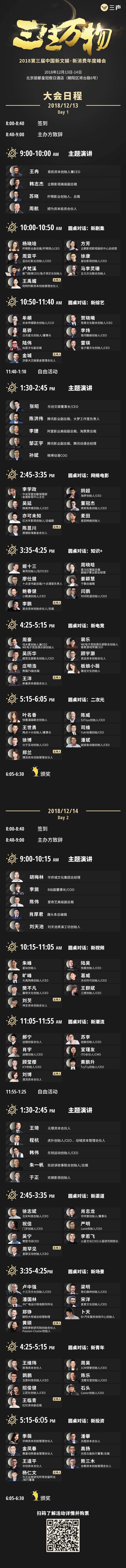 此次峰会主题为“三生万物”,将会有超100位演讲、论坛对话嘉宾,愈500位文娱、消费领域的投资人和创始人,以及近2000位文娱、消费领域的创造者,齐聚一堂,建言献策,为行业把脉,共同探讨新文娱和新消费领域的新变化与新机遇。