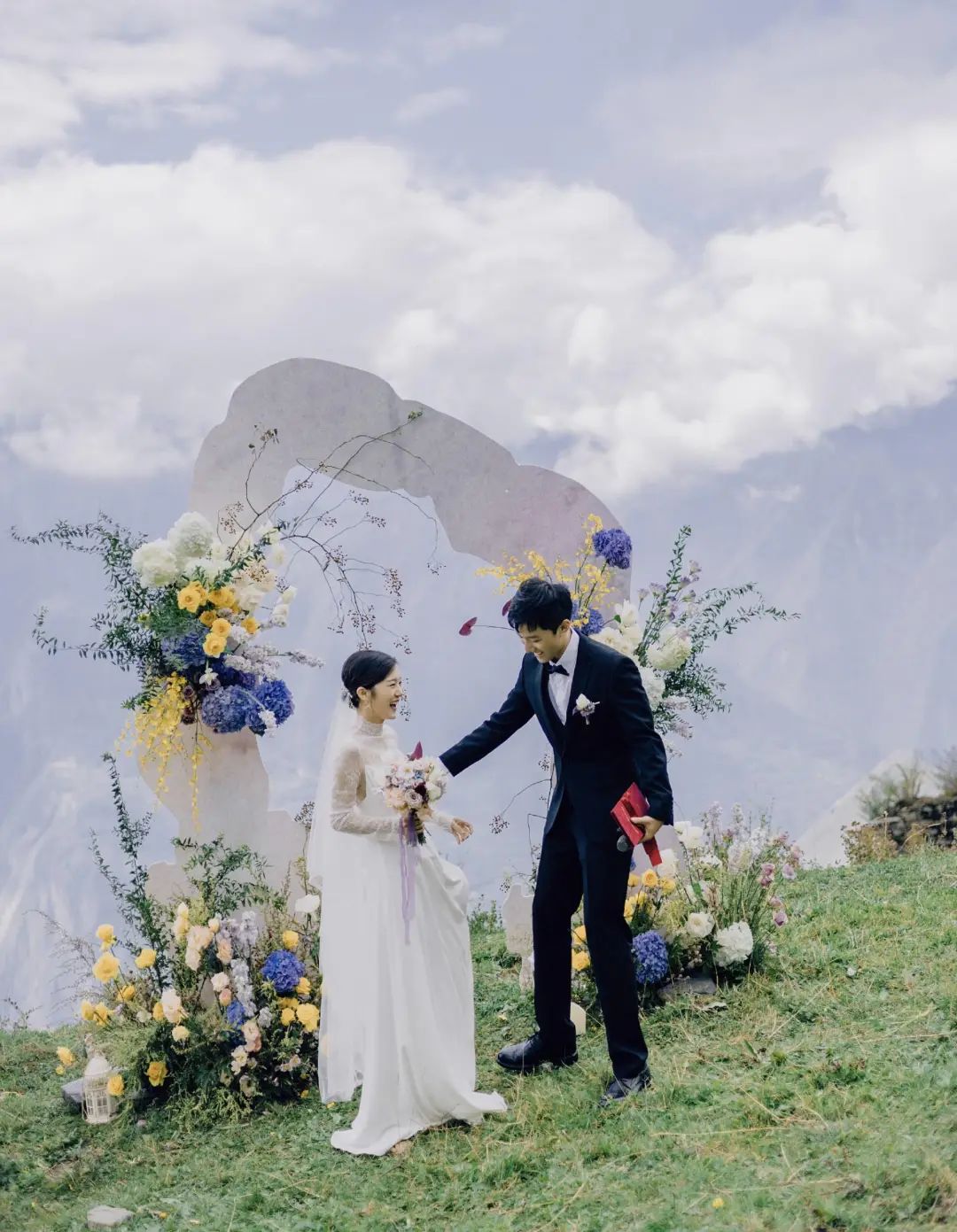 九月份,在四川阿坝州的浮云牧场里,小王和爱人站在山谷面前,背靠鲜花和白云,“一个靠近天空和自由的地方”。草坪上只有一群陌生人,几位婚庆公司的工作人员、四五位当地的藏民,和他们的山羊。