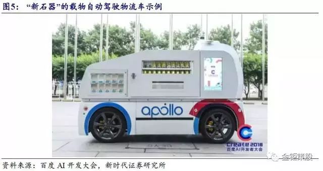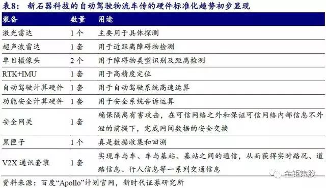 我们认为,各类创业公司基于百度提供的软硬件解决方案深耕自动驾驶的特定场景应用将会成为特定场景自动驾驶产业化的主要模式之一。典型代表如创业公司“新石器”与百度合作研发的自动驾驶物流车。该车已在雄安和常州投入使用,搭载了激光雷达、视觉感知、RTK和惯性导航方案,有麦佛逊式独立悬架,4G三网全互联。该车可以20公里的时速实现5公里半径的物流运输任务;具有插拔式换电方案,支持24小时不间断运营;具有智能模块化货箱,可快速便捷的替换不同需求功能的货箱,满足更多场景需求。