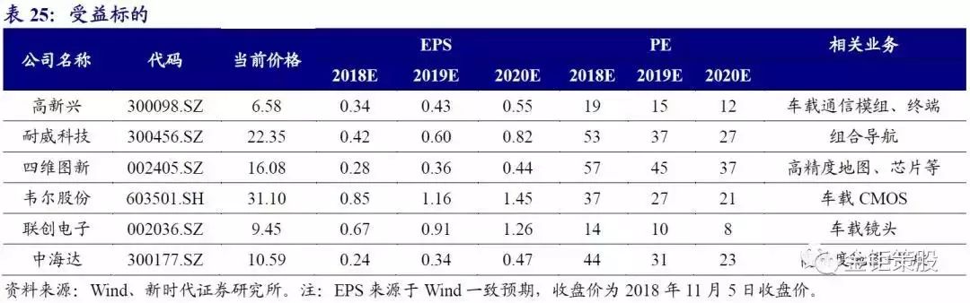 综合考虑技术成熟度、成本、应用场景等因素,我们看好A股上市公司在车载通信设备、视觉传感器零部件、车载芯片、高精度地图,导航方向的突破潜力。受益标的包括:高新兴(车规级通信模组)、耐威科技(导航)、四维图新(高精度地图+车载芯片)、韦尔股份(车载CMOS芯片)、联创电子(车载ADAS摄像头)、中海达(高精度地图+导航)等。