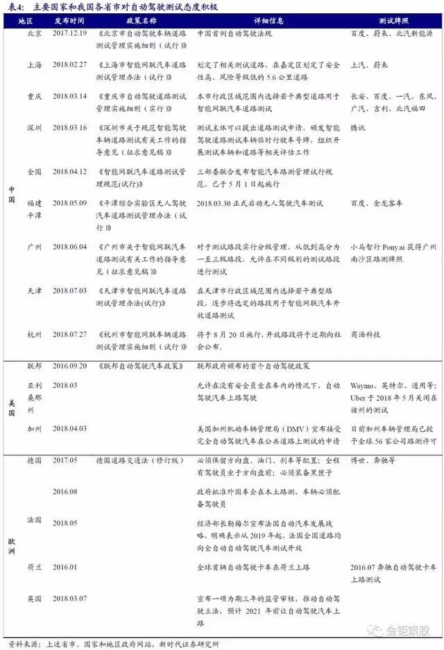 国内外的政府机构对自动驾驶技术发展都持鼓励态度,并积极推进自动驾驶政策落地。目前,全球大部分政府允许在配备安全驾驶员的前提下,进行自动驾驶车辆的路测。美国加州和亚利桑那州已在推进完全自动驾驶车辆的测试。我们认为,随着自动驾驶技术的进一步成熟,各国政府会加大开放力度在保证公共安全的前提下支持科技创新。