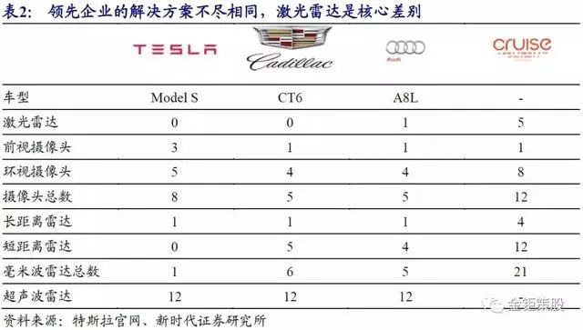 传感器方案的主要差别来自激光雷达的使用。多数企业选择激光雷达作为核心传感器,例如奥迪A8L使用1个激光雷达,Waymo和Cruise AV均使用“高线束+低线束”的激光雷达组合实现建模。而另一类企业认为激光雷达的成本过高,而通过毫米波+摄像头的模式也可以实现Level 4以上级别的自动驾驶,例如特斯拉的解决方案仅用了毫米波雷达+摄像头进行建模。