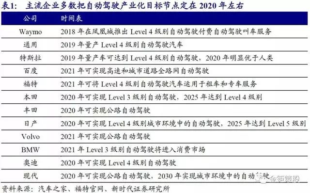随着算法和传感器领域的不断进步,汽车制造和互联网科技企业纷纷加大了对自动驾驶行业的布局力度。其中,Waymo、GM Cruise和Tesla等公司在产业化成熟度上较为领先,其他厂商多数把量产乘用车实现Level 3以上级别自动驾驶的时间表定在了2020-2021年左右。