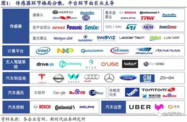 自动驾驶主要产业链分为传感器、计算平台、自动驾驶系统、汽车制造商、汽车通讯、汽车控制和汽车运营等细分行业。其中,传感器行业受益自动驾驶的新需求,产生了多家技术领先的初创公司,整体竞争格局较为分散;而计算平台、整车制造对资源和技术整合能力要求较高,由巨头主导。